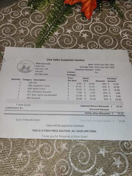 The total is already discounted with any sales you received, and you invoice is ready for check out. All you need to do is add it to your cart, along with any other items you would like to purchase and we will get your treasures on the way!