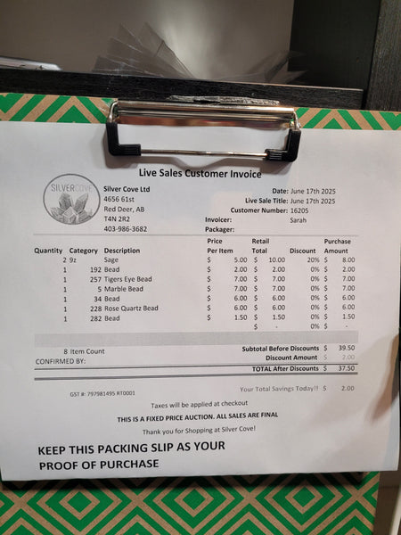The total is already discounted with any sales you received, and you invoice is ready for check out. All you need to do is add it to your cart, along with any other items you would like to purchase and we will get your treasures on the way!