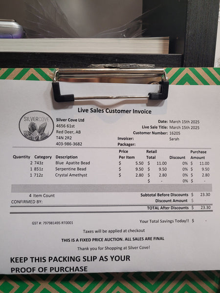 The total is already discounted with any sales you received, and you invoice is ready for check out. All you need to do is add it to your cart, along with any other items you would like to purchase and we will get your treasures on the way!