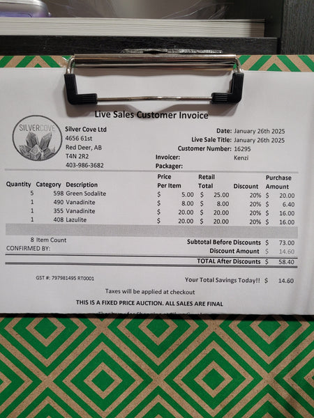 This is your invoice for the date listed above, and we hope you are as excited to get your items as we are! A photo of you invoice and your item(s) are included in this listing for you to review.