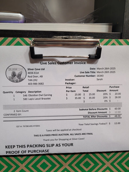 This is your invoice for the date listed above, and we hope you are as excited to get your items as we are! A photo of you invoice and your item(s) are included in this listing for you to review.
