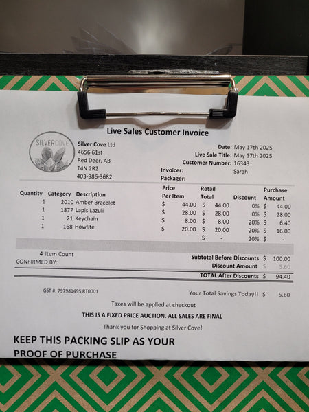 The total is already discounted with any sales you received, and you invoice is ready for check out. All you need to do is add it to your cart, along with any other items you would like to purchase and we will get your treasures on the way!