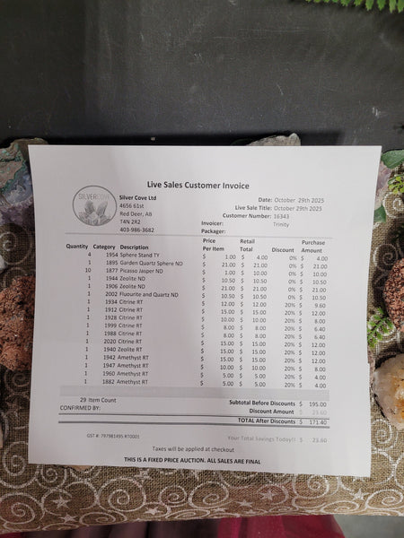 The total is already discounted with any sales you received, and you invoice is ready for check out. All you need to do is add it to your cart, along with any other items you would like to purchase and we will get your treasures on the way!
