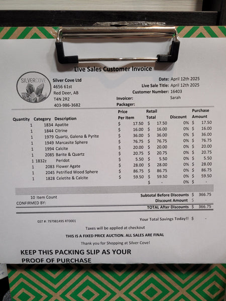 This is your invoice for the date listed above, and we hope you are as excited to get your items as we are! A photo of you invoice and your item(s) are included in this listing for you to review.