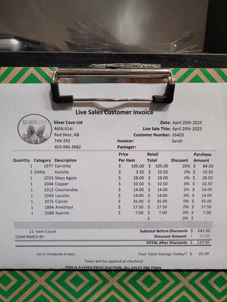 The total is already discounted with any sales you received, and you invoice is ready for check out. All you need to do is add it to your cart, along with any other items you would like to purchase and we will get your treasures on the way!