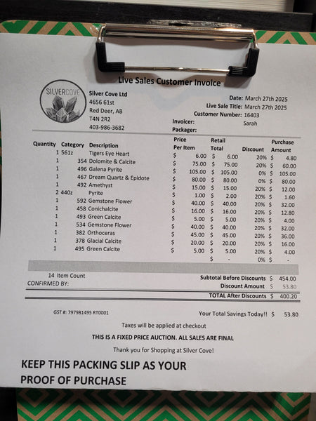 The total is already discounted with any sales you received, and you invoice is ready for check out. All you need to do is add it to your cart, along with any other items you would like to purchase and we will get your treasures on the way!