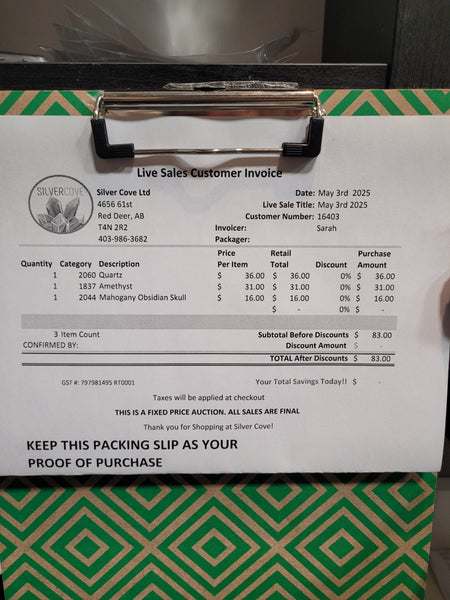 This is your invoice for the date listed above, and we hope you are as excited to get your items as we are! A photo of you invoice and your item(s) are included in this listing for you to review.