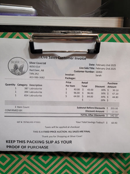 The total is already discounted with any sales you received, and you invoice is ready for check out. All you need to do is add it to your cart, along with any other items you would like to purchase and we will get your treasures on the way!