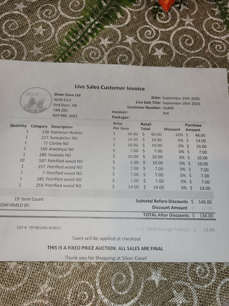 The total is already discounted with any sales you received, and you invoice is ready for check out. All you need to do is add it to your cart, along with any other items you would like to purchase and we will get your treasures on the way!