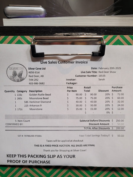 The total is already discounted with any sales you received, and you invoice is ready for check out. All you need to do is add it to your cart, along with any other items you would like to purchase and we will get your treasures on the way!