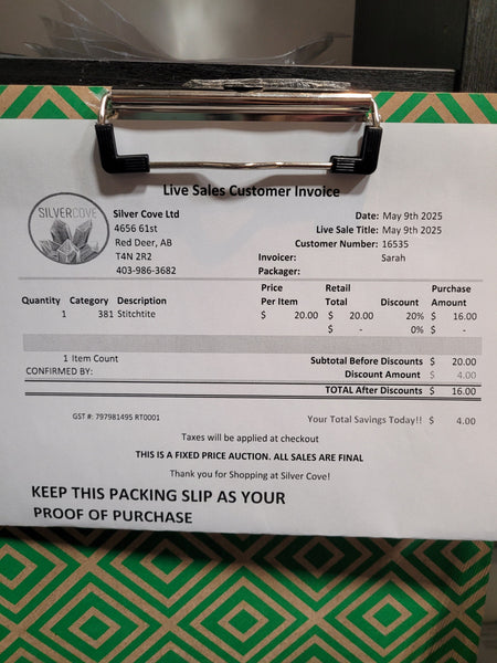 This is your invoice for the date listed above, and we hope you are as excited to get your items as we are! A photo of you invoice and your item(s) are included in this listing for you to review.