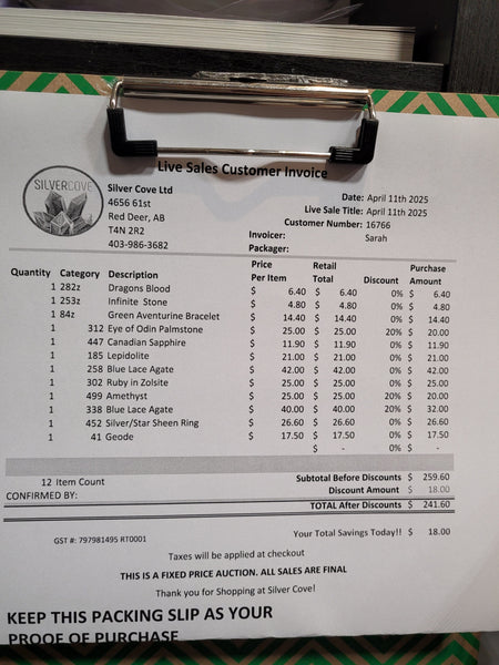 The total is already discounted with any sales you received, and you invoice is ready for check out. All you need to do is add it to your cart, along with any other items you would like to purchase and we will get your treasures on the way!