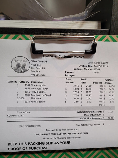 This is your invoice for the date listed above, and we hope you are as excited to get your items as we are! A photo of you invoice and your item(s) are included in this listing for you to review.