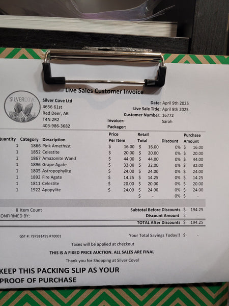 This is your invoice for the date listed above, and we hope you are as excited to get your items as we are! A photo of you invoice and your item(s) are included in this listing for you to review.
