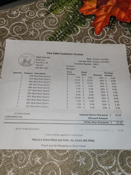 The total is already discounted with any sales you received, and you invoice is ready for check out. All you need to do is add it to your cart, along with any other items you would like to purchase and we will get your treasures on the way!