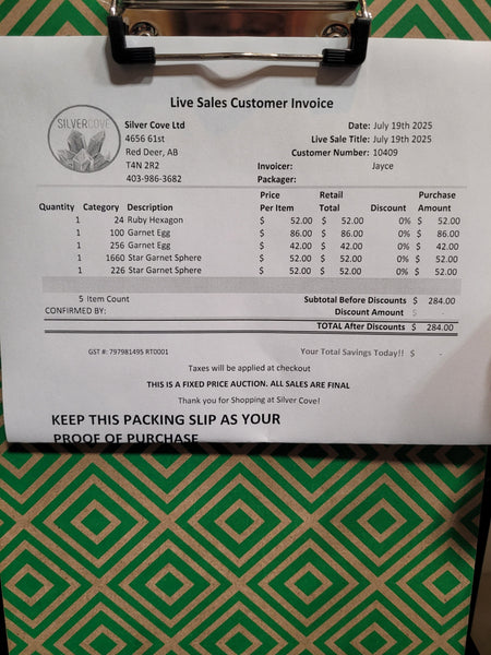 The total is already discounted with any sales you received, and you invoice is ready for check out. All you need to do is add it to your cart, along with any other items you would like to purchase and we will get your treasures on the way!