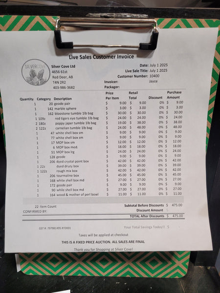 This is your invoice for the date listed above, and we hope you are as excited to get your items as we are! A photo of you invoice and your item(s) are included in this listing for you to review.