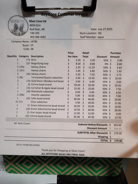 The total is already discounted with any sales you received, and you invoice is ready for check out. All you need to do is add it to your cart, along with any other items you would like to purchase and we will get your treasures on the way!