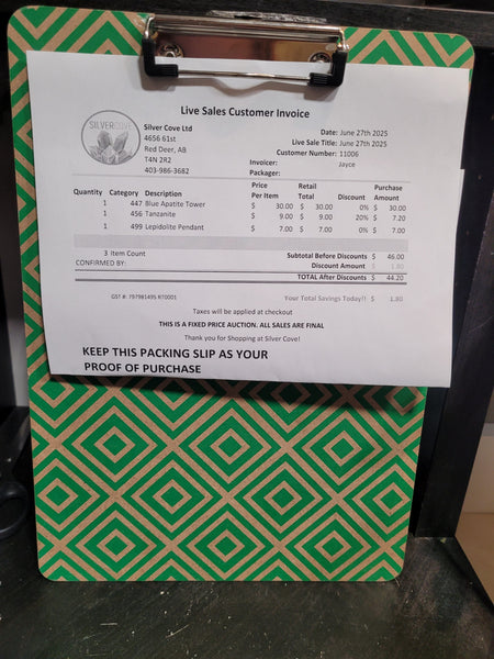 This is your invoice for the date listed above, and we hope you are as excited to get your items as we are! A photo of you invoice and your item(s) are included in this listing for you to review.